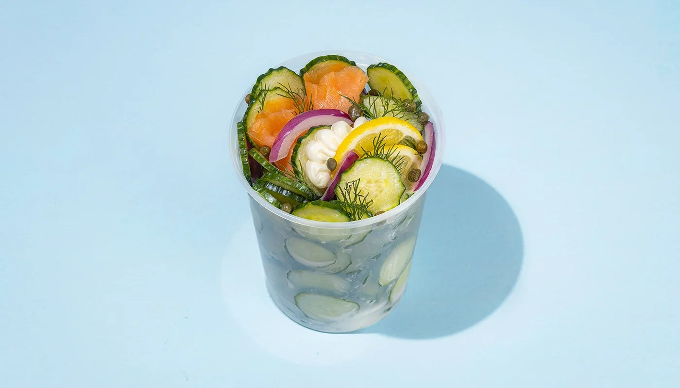 Thinly sliced cucumber combined with smoked salmon, capers, cream cheese, fresh dill, lemon juice, and…