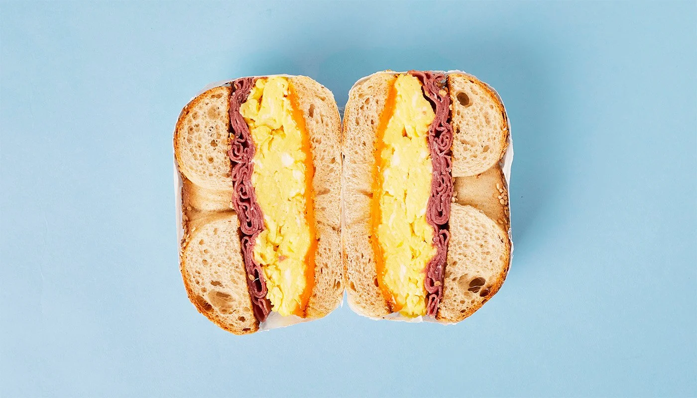 Choice of bagel with pastrami, scrambled eggs, and your choice of cheese