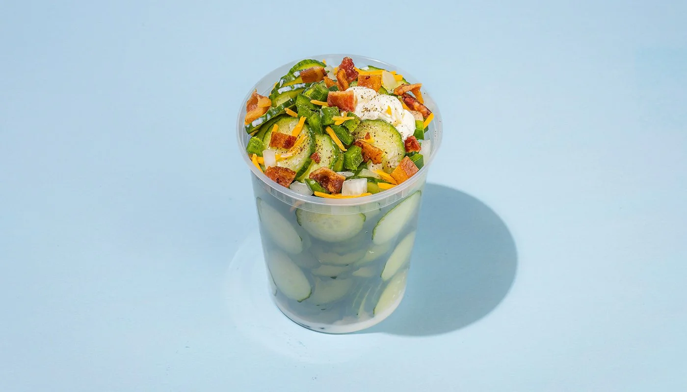 Thinly sliced cucumber with sour cream, cream cheese, shredded cheddar, chopped onion, and diced…