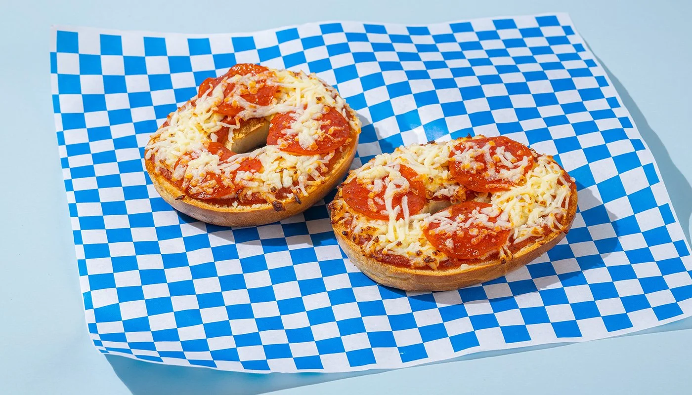 Your choice of bagel (split) topped with pizza sauce, mozzarella cheese, and pepperoni.